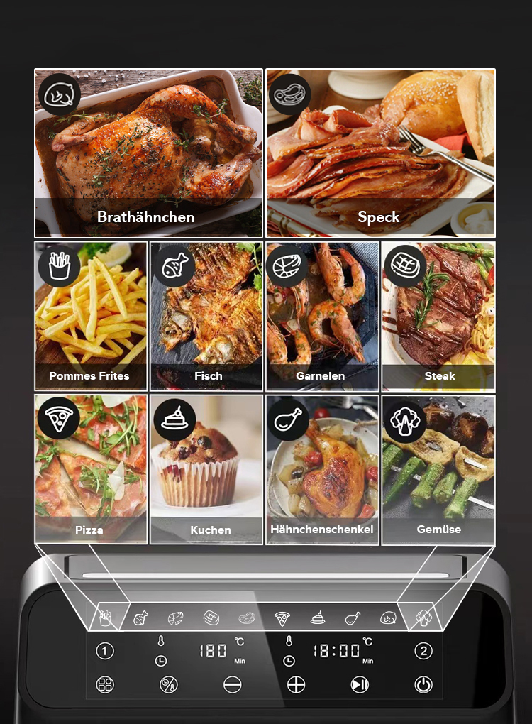 Der Heißluftfritteuse nutzt überhitzte Luft und ein effizientes Luftstromdesign, um knusprige, köstliche frittierte Speisen ohne schlechtes Gewissen zuzubereiten.