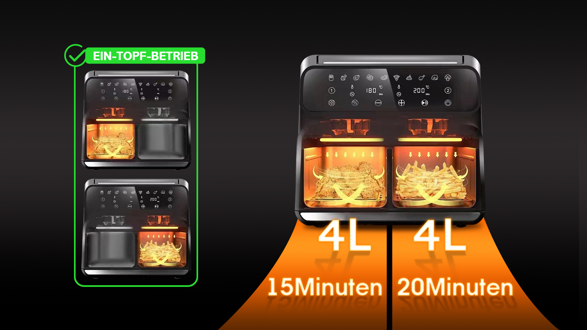Verwendung dieser Doppel-Luftfritteuse beim Vergleich der Energie, die zum Garen eines Hähnchens in einem 1,8-kW-Elektroofen verbraucht wird.