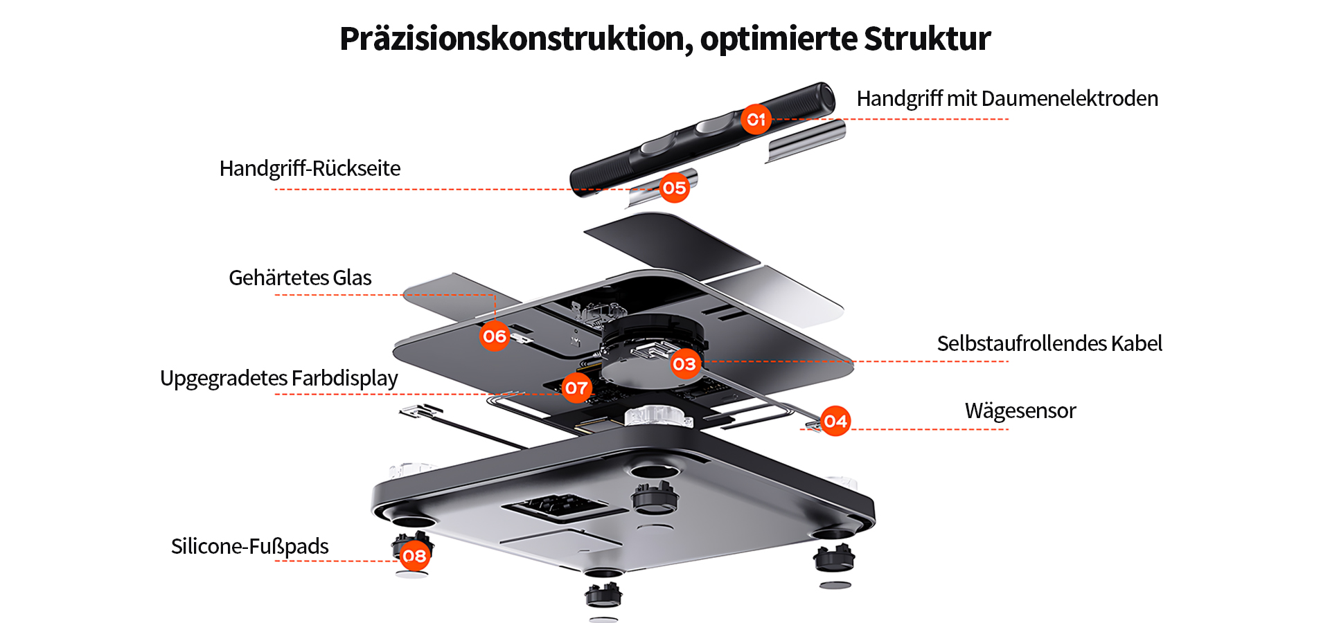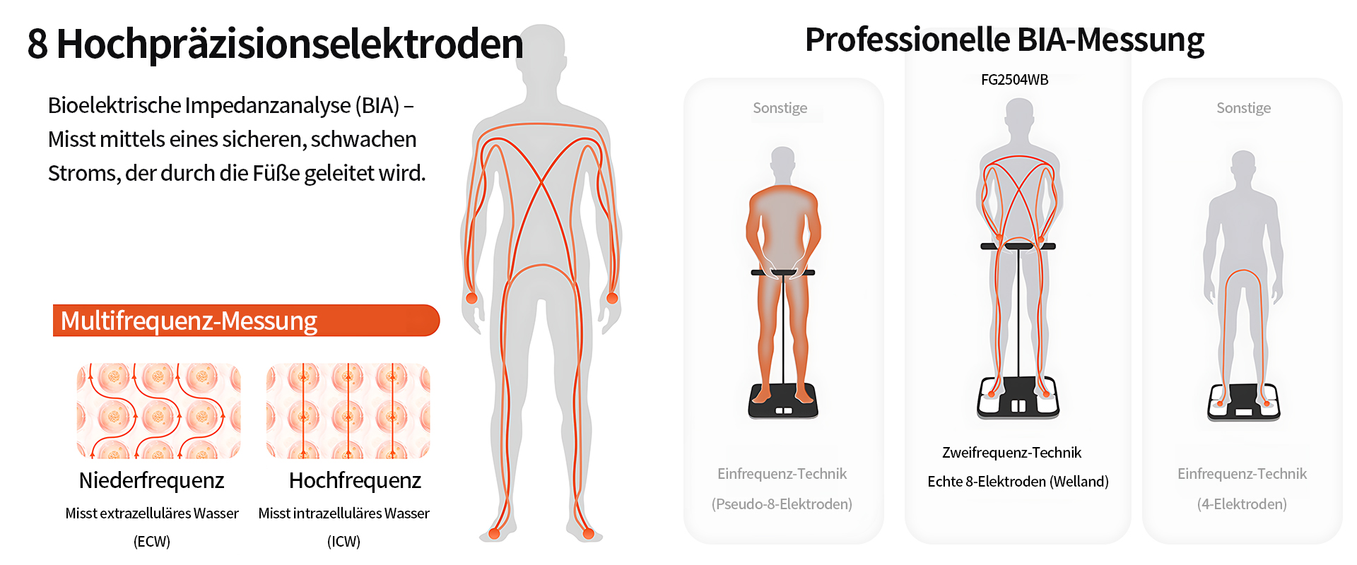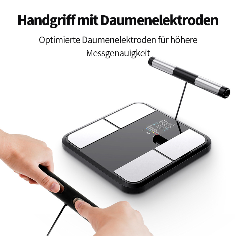 Unsere 8-Elektroden-Körperanalysewaage ermöglicht eine präzise Analyse der Körperzusammensetzung direkt zu Hause.