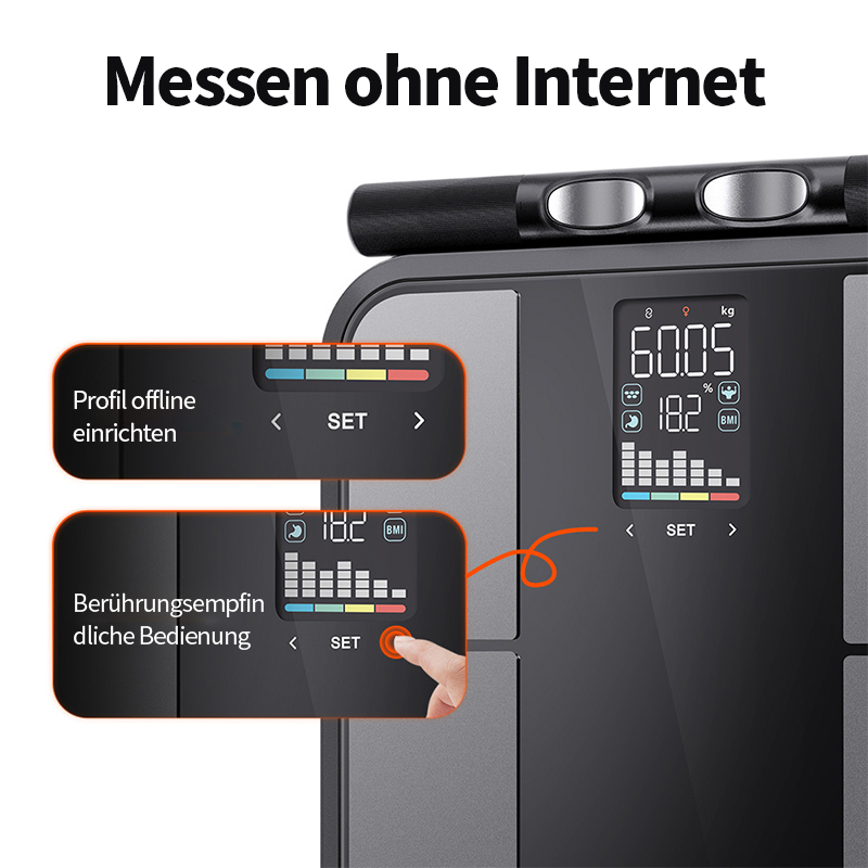 Verbesserte Metall-Daumenelektroden und der WL37-Algorithmus, der mit DEXA-Referenzmessungen abgeglichen wurde, sorgen für zuverlässige Ergebnisse. Das Vollfarbdisplay, Bluetooth 5.0 und die Offline-Messfunktion ermöglichen eine mühelose tägliche Gesundheitskontrolle.