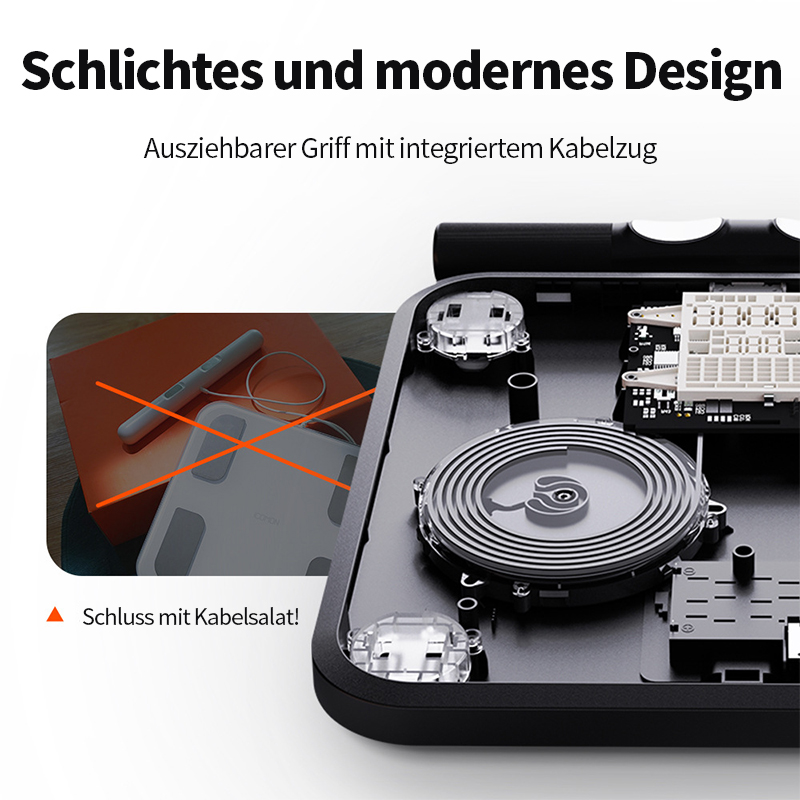 Der ausziehbare Griff mit integriertem Kabelspeicher hält alles ordentlich verstaut und verhindert lose Kabel oder Unordnung.