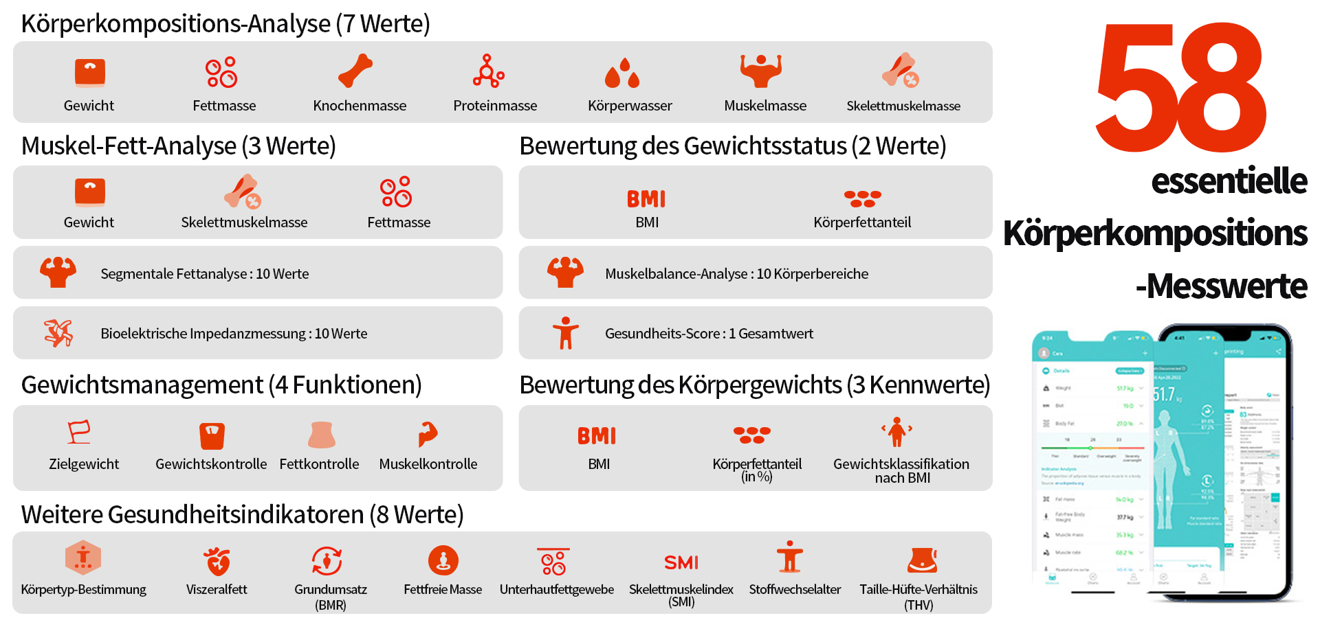 Dank Hand-zu-Fuß-Messung, Dual-Frequency-BIA (20 kHz + 100 kHz) und 5-Segment-Ganzkörperanalyse erfasst sie über 58 Gesundheitswerte mit hoher Genauigkeit.