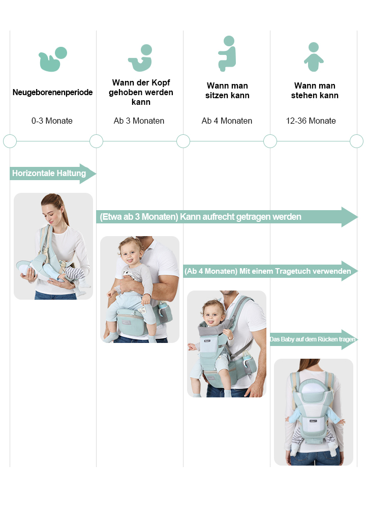 Babys sollten in einer Position getragen werden, bei der ihre Beine gespreizt sind und die Knie ungefähr auf der gleichen Höhe wie die Hüften liegen. Dies reduziert die Belastung der Hüftgelenke und hilft, einer Hüftdysplasie vorzubeugen.