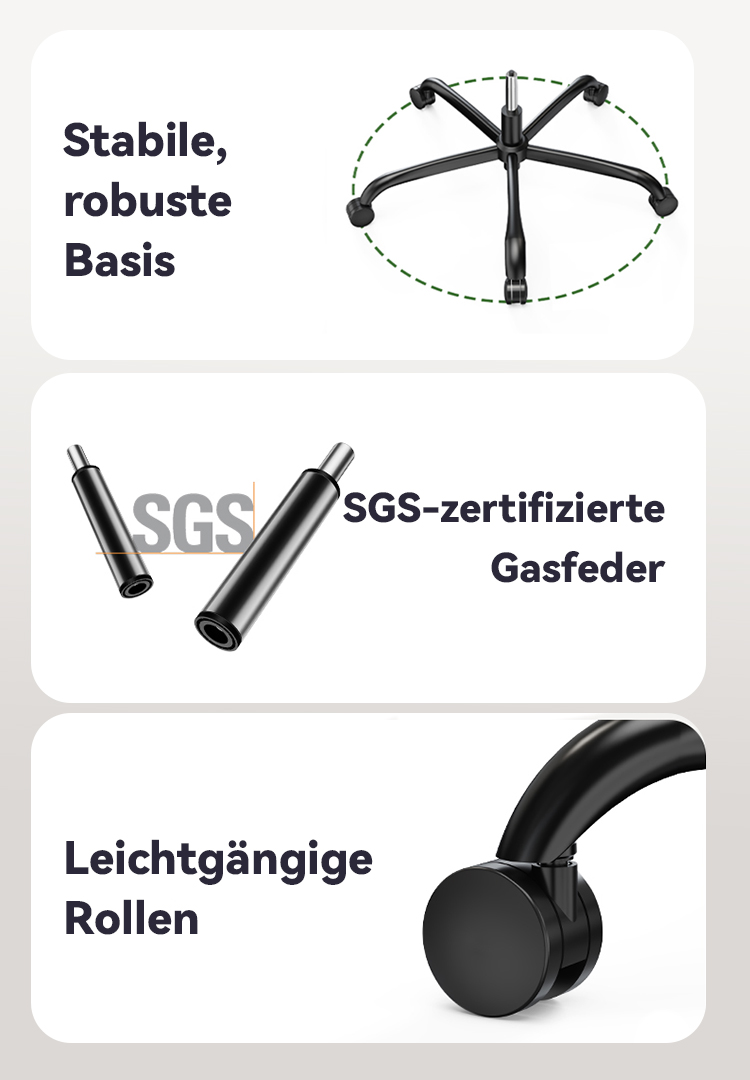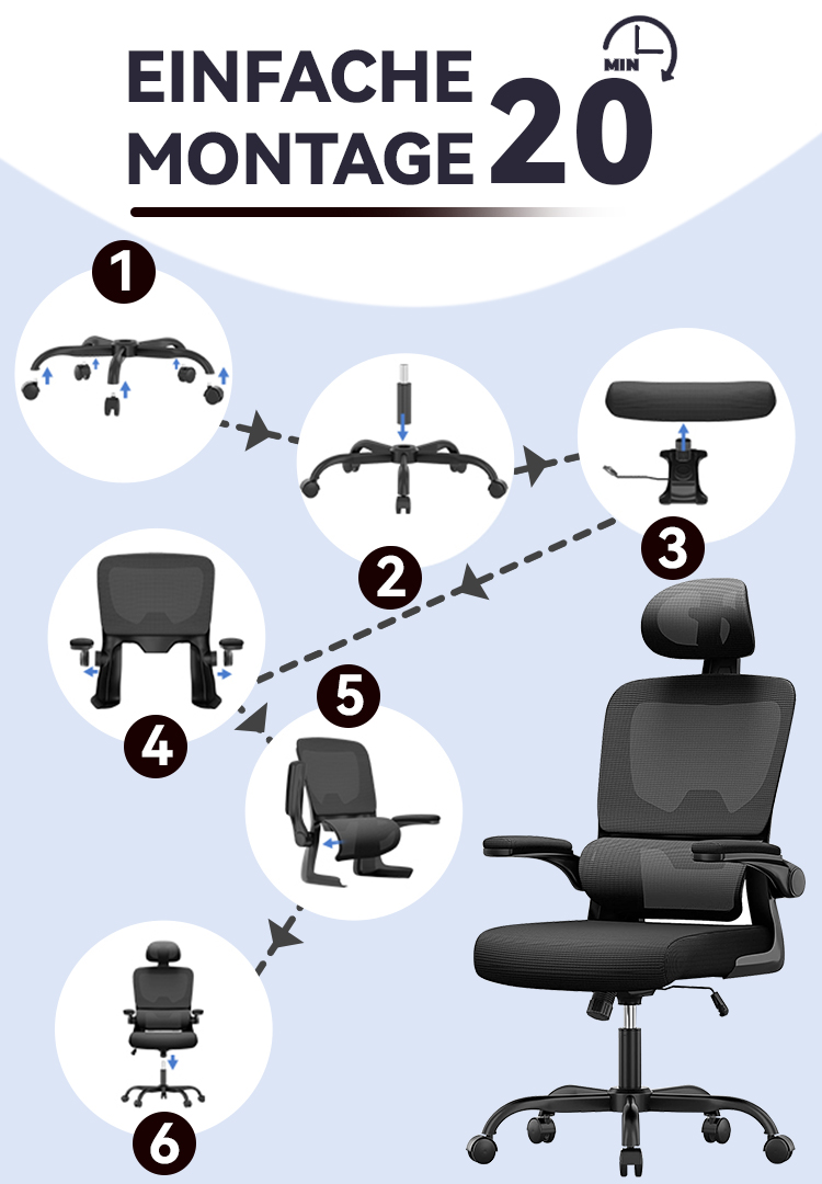 Alle notwendigen Teile, Schrauben und eine leicht verständliche Anleitung sind im Paket enthalten, sodass der Aufbau in nur 6 Schritten innerhalb von 20 Minuten gelingt. Dieser ergonomische Computer-Bürostuhl besteht aus einem Rücken aus Kunststoff & Netz, einem hochwertigen Schaumstoffsitz, einer SGS-zertifizierten Gasdruckfeder sowie einem Nylonfußkreuz mit Rollen. Belastbar bis zu 150 kg/300 lb.
