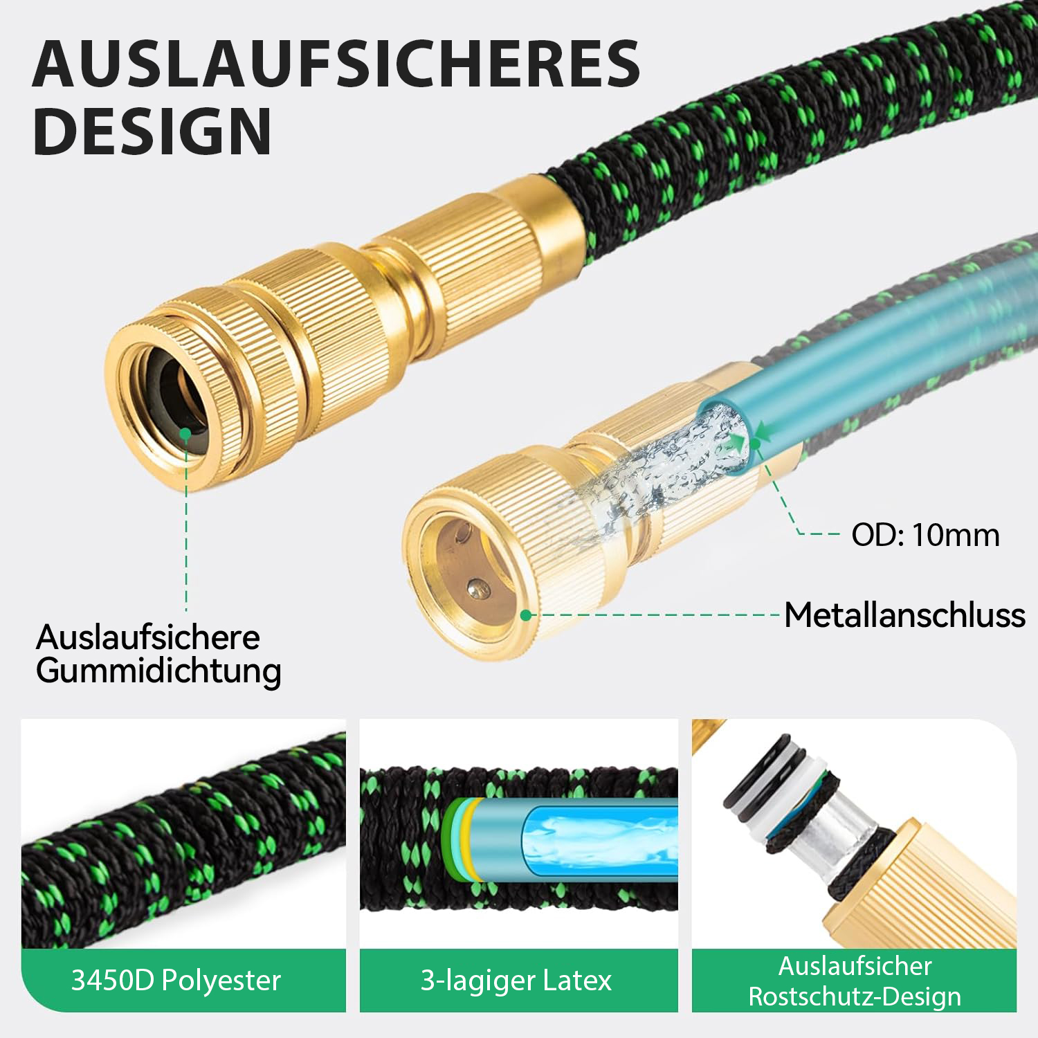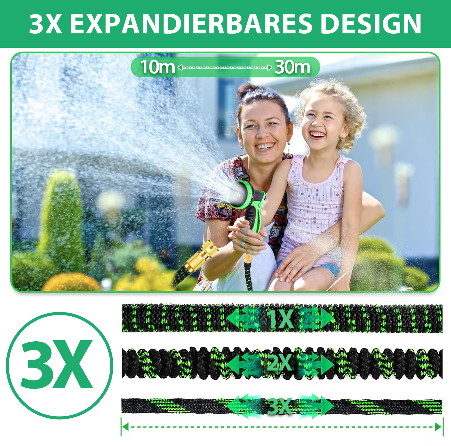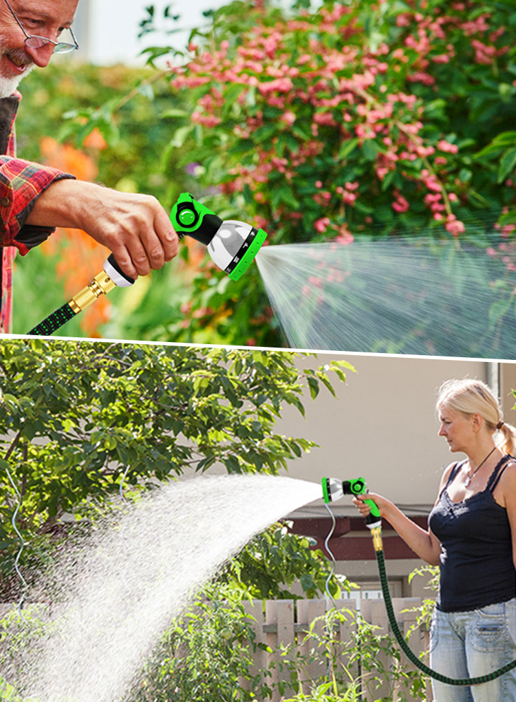 Dieser erweiterbare Gartenschlauch kann sich unter Wasserdruck auf bis zu 30 Meter dehnen, erreicht schnell seine volle Länge und schrumpft bei Nichtbenutzung auf nur 10 Meter zurück. Diese Funktion macht die Lagerung einfach und bequem, perfekt für jeden Außenbereich.