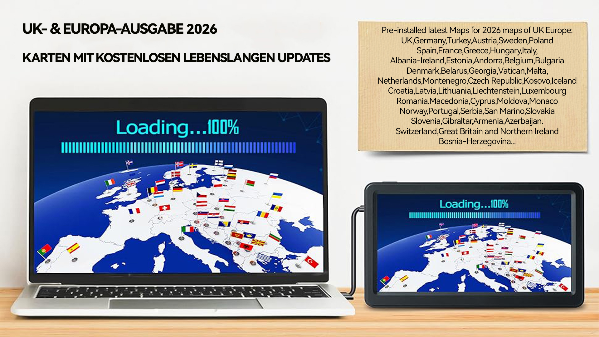 Aktuelle Karten für Europa (inkl. Großbritannien) sind bereits vorinstalliert, sodass Sie das Gerät überall in Europa einsetzen können. Das Beste: Kartenupdates sind lebenslang kostenlos und können online über eine Website heruntergeladen werden – ganz ohne Abo.