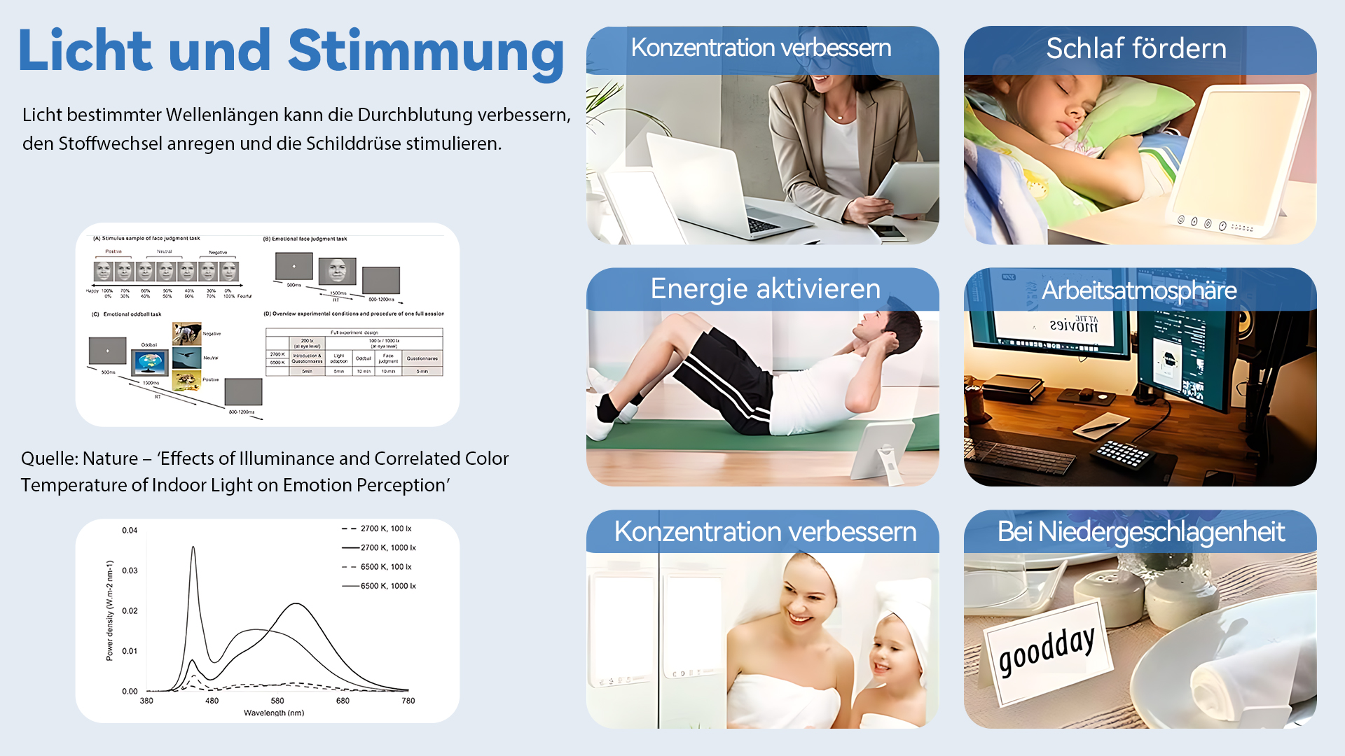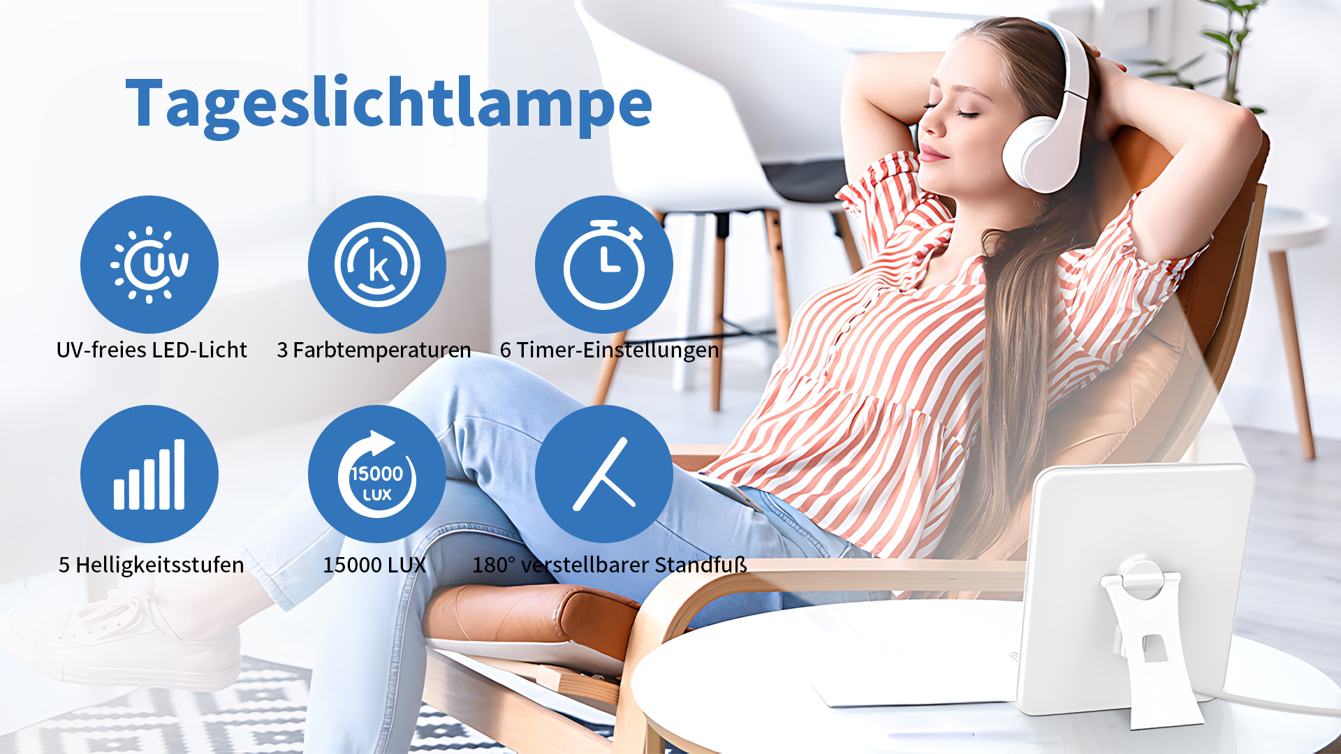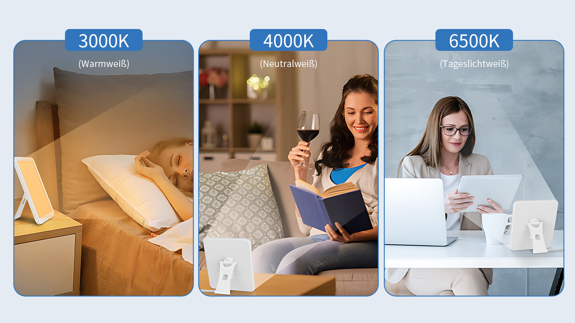Unsere Lichttherapielampe bietet 3 Farbtemperatur-Modi: Warmweiß (3000 K), Neutralweiß (4000 K) und Kaltweiß (6500 K). Tippen Sie einfach auf die Taste, um zwischen den Lichtfarben zu wechseln. Ob warmes, behagliches Licht zur Entspannung oder helles, kühles Licht für fokussiertes Arbeiten – Sie können die passende Lichtstimmung je nach Abstand, Umgebung und Lichtempfindlichkeit einstellen.