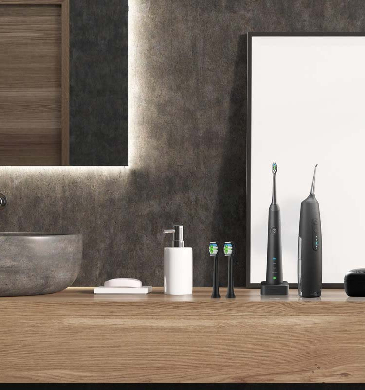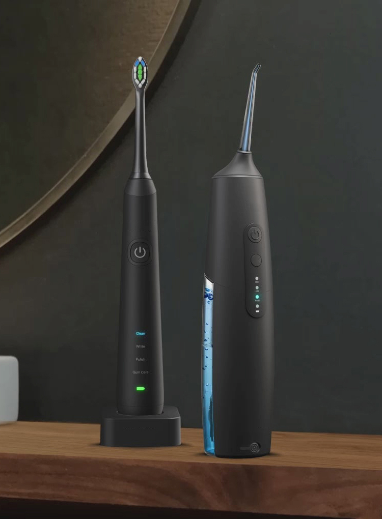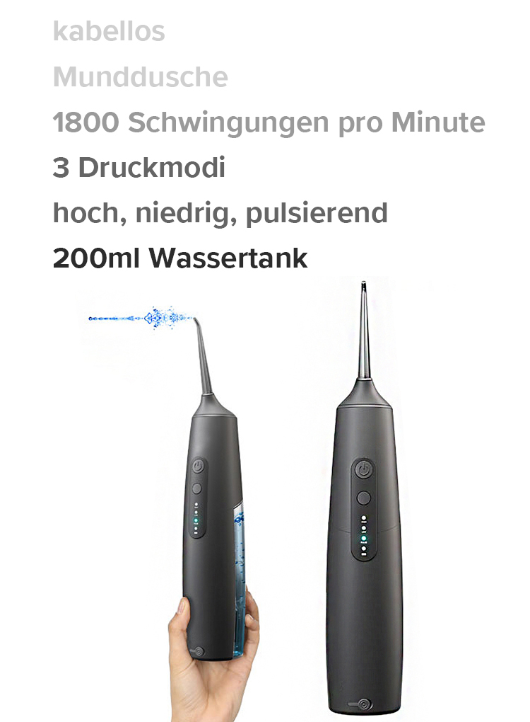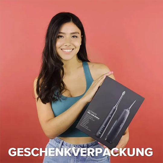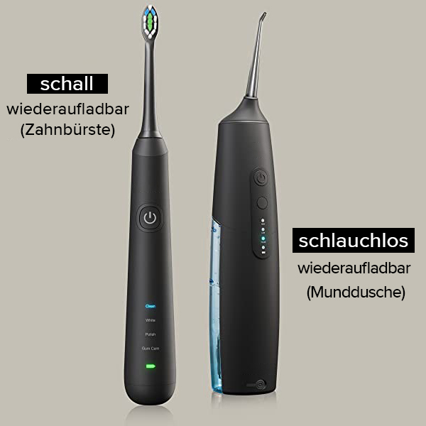 Schallzahnbürste und kabellose Munddusche in einem Set – ideal für tägliche Pflege, Zahnspangen, Implantate & empfindliche Zähne.